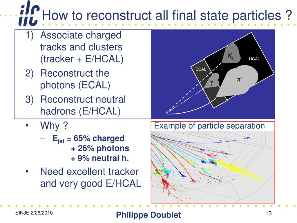 Associate charged tracks and clusters (tracker + E/HCAL) Reconstruct the photons (ECAL) Reconstruct neutral hadrons (E/HCAL) Why ? Ejet = 65% charged + 26% photons + 9% neutral h. Need excellent tracker and very good E/HCAL Example of particle separation How to reconstruct all final state particles ? KL HCAL ECAL π+ γ Philippe Doublet