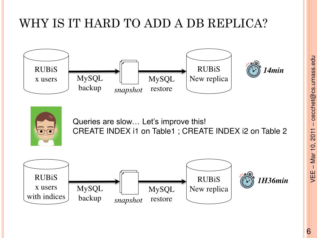 WHY IS IT HARD TO ADD A DB REPLICA? snapshot snapshot RUBiS New replica RUBiS x users 14min MySQL backup MySQL restore Queries are slow… Let’s improve this! CREATE INDEX i1 on Table1 ; CREATE INDEX i2 on Table 2 RUBiS New replica RUBiS x users with indices 1H36min MySQL backup MySQL restore