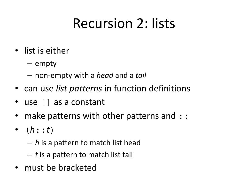 Recursion 2: lists • list is either • empty • non-empty with a head and a tail • can use list patterns in function definitions • use [] as a constant • make patterns with other patterns and :: • (h::t) • h is a pattern to match list head • t is a pattern to match list tail • must be bracketed