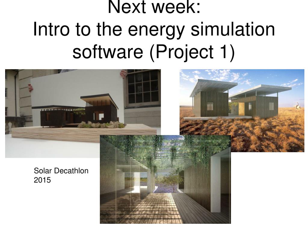 Next week: Intro to the energy simulation software (Project 1) Solar Decathlon 2015