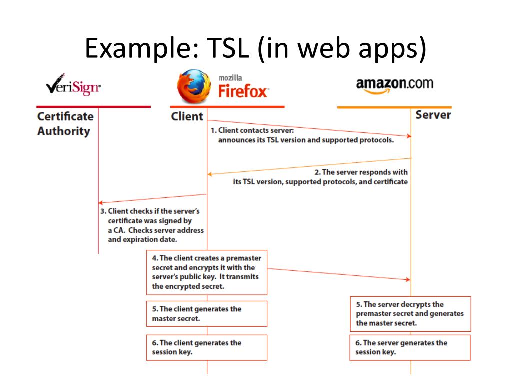 Recall: Key exchanges • Simple protocol: • Alice sends her public key to Bob. • Bob sends his public key to Alice. • Alice encrypts message with Bob’s public key, so Bob can decrypt with his private key. • Bob encrypts with Alice’s public key, and she can then decrypt with her own private key.