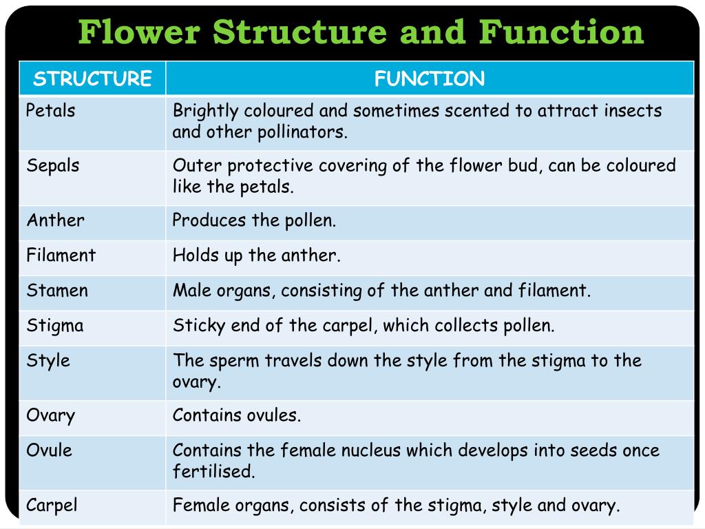 Flower Structure and Function • Complete the card sort to match the different floral structures with their functions.