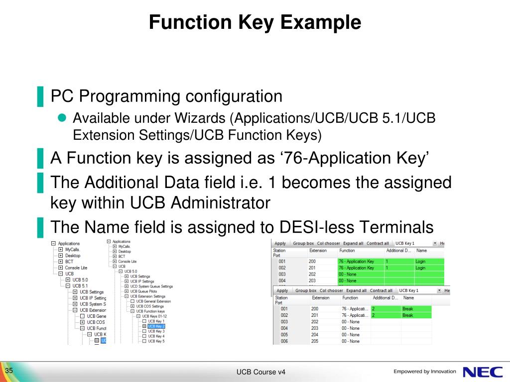 Function Key Example • PC Programming configuration • Available under Wizards (Applications/UCB/UCB 5.1/UCB Extension Settings/UCB Function Keys) • A Function key is assigned as ‘76-Application Key’ • The Additional Data field i.e. 1 becomes the assigned key within UCB Administrator • The Name field is assigned to DESI-less Terminals