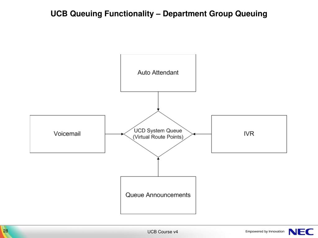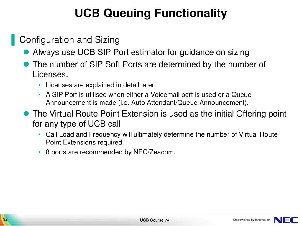 UCB Queuing Functionality • Configuration and Sizing • Always use UCB SIP Port estimator for guidance on sizing • The number of SIP Soft Ports are determined by the number of Licenses. • Licenses are explained in detail later. • A SIP Port is utilised when either a Voicemail port is used or a Queue Announcement is made (i.e. Auto Attendant/Queue Announcement). • The Virtual Route Point Extension is used as the initial Offering point for any type of UCB call • Call Load and Frequency will ultimately determine the number of Virtual Route Point Extensions required. • 8 ports are recommended by NEC/Zeacom.