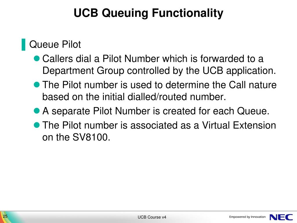 UCB Queuing Functionality • Queue Pilot • Callers dial a Pilot Number which is forwarded to a Department Group controlled by the UCB application. • The Pilot number is used to determine the Call nature based on the initial dialled/routed number. • A separate Pilot Number is created for each Queue. • The Pilot number is associated as a Virtual Extension on the SV8100.