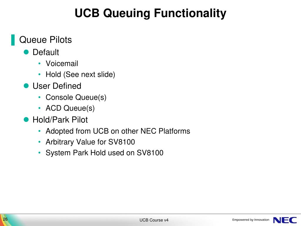 UCB Queuing Functionality • Queue Pilots • Default • Voicemail • Hold (See next slide) • User Defined • Console Queue(s) • ACD Queue(s) • Hold/Park Pilot • Adopted from UCB on other NEC Platforms • Arbitrary Value for SV8100 • System Park Hold used on SV8100