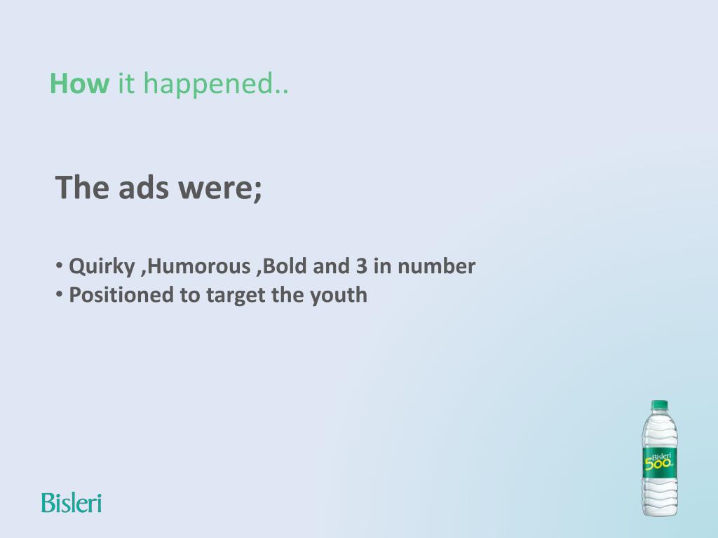 How it happened.. • The ads were; • Quirky ,Humorous ,Bold and 3 in number • Positioned to target the youth
