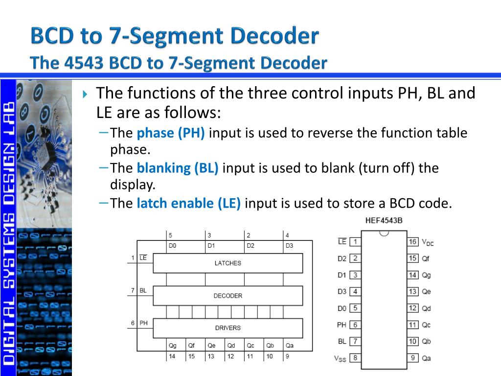 BCD to 7-Segment DecoderThe 4543 BCD to 7-Segment Decoder • The functions of the three control inputs PH, BL and LE are as follows: • The phase (PH) input is used to reverse the function table phase. • The blanking (BL) input is used to blank (turn off) the display. • The latch enable (LE) input is used to store a BCD code.