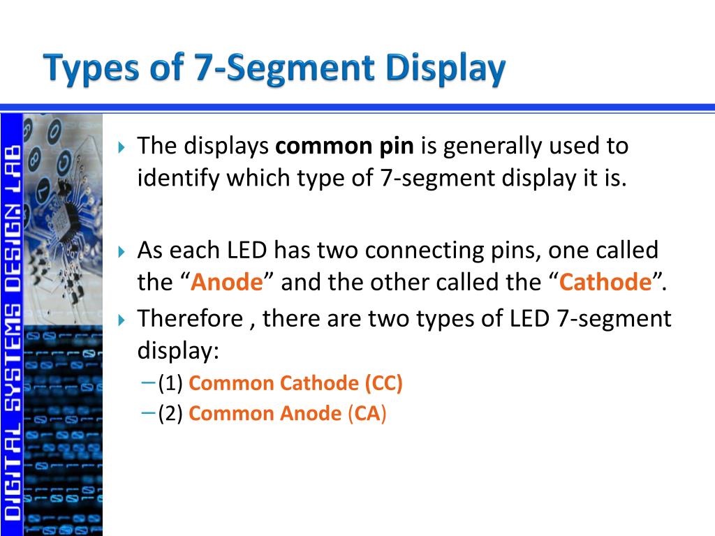 Types of 7-Segment Display • The displays common pin is generally used to identify which type of 7-segment display it is. • As each LED has two connecting pins, one called the “Anode” and the other called the “Cathode”. • Therefore , there are two types of LED 7-segment display: • (1) Common Cathode (CC) • (2) Common Anode (CA)