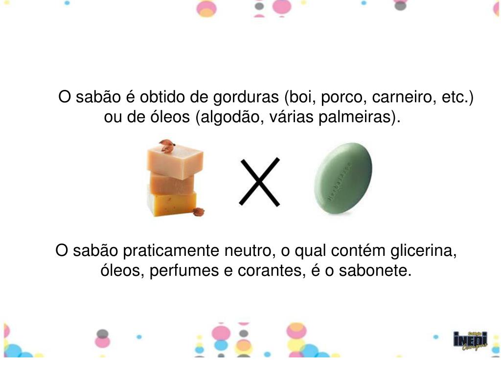 Hoje, saponificação é . . . O sabão é obtido de gorduras (boi, porco, carneiro, etc.) ou de óleos (algodão, várias palmeiras). . O sabão praticamente neutro, o qual contém glicerina, óleos, perfumes e corantes, é o sabonete.