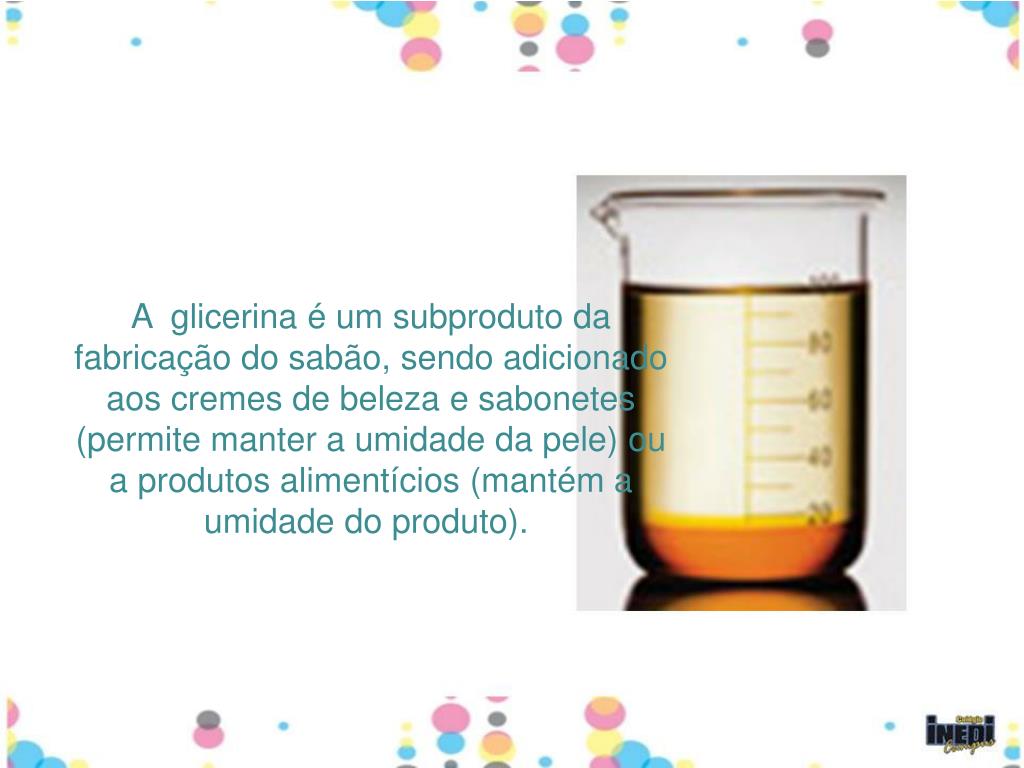 A glicerina é um subproduto da fabricação do sabão, sendo adicionado aos cremes de beleza e sabonetes (permite manter a umidade da pele) ou a produtos alimentícios (mantém a umidade do produto).