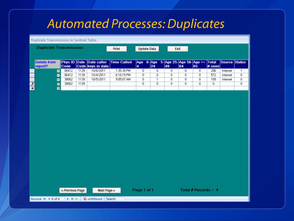 Data Cleaning: Why do it? • To check for validity and consistency of reported variables • Ensures that the data collected makes sense • Examples: • # of ILI cases is not greater than the # of patient visits • The date of onset is before data of death • Only enrolled sites should be reporting & included in analysis of sentinel data • To check for data outliers • A facility that normally sees ~100 patient visits will probably not see 1,000 patients during a week • To identify and remove duplicate records