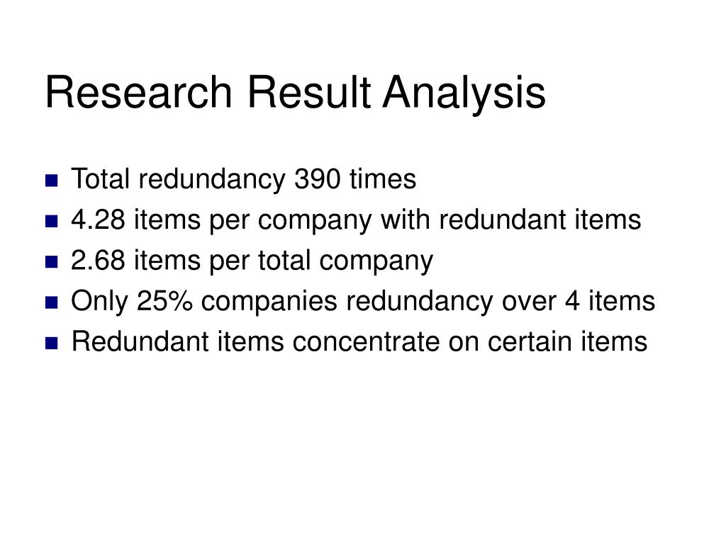 Research Result Analysis • Total redundancy 390 times • 4.28 items per company with redundant items • 2.68 items per total company • Only 25% companies redundancy over 4 items • Redundant items concentrate on certain items