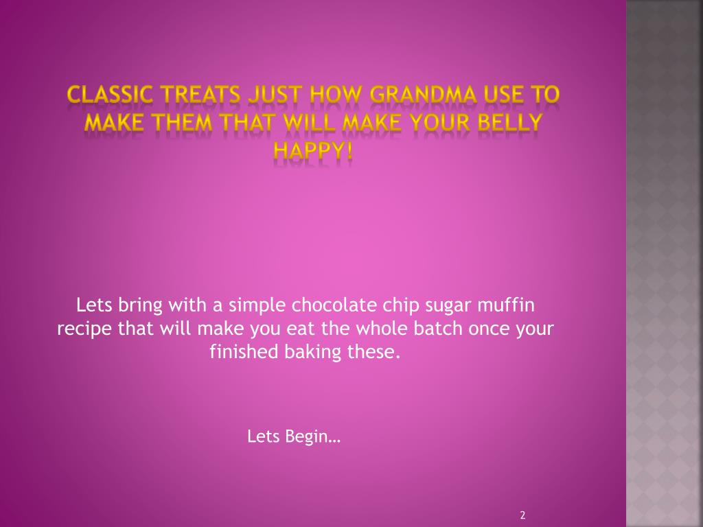 Yummy Tummy Treats. Created by: Sylvia Vasquez. Classic treats just how grandma use to make them that will make your belly happy!. Lets bring with a simple chocolate chip sugar muffin recipe that will make you eat the whole batch once your finished baking these. Lets Begin….