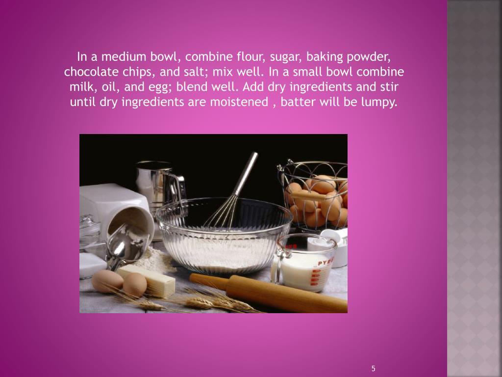 In a medium bowl, combine flour, sugar, baking powder, chocolate chips, and salt; mix well. In a small bowl combine milk, oil, and egg; blend well. Add dry ingredients and stir until dry ingredients are moistened , batter will be lumpy.