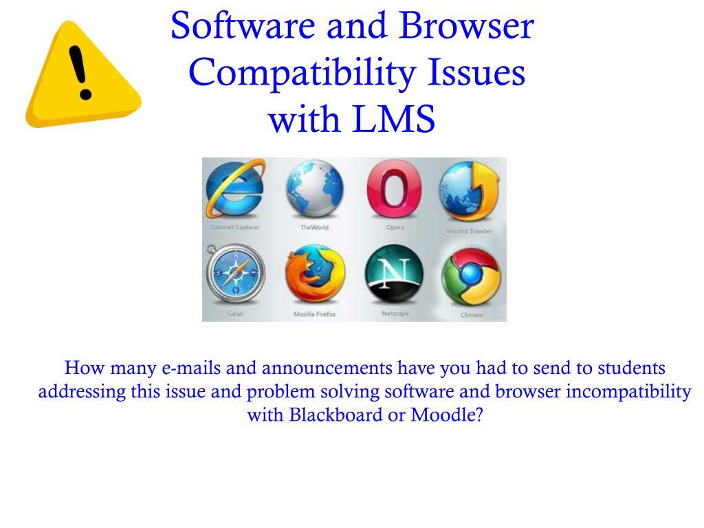 Software and Browser Compatibility Issueswith LMS How many e-mails and announcements have you had to send to students addressing this issue and problem solving software and browser incompatibility with Blackboard or Moodle?