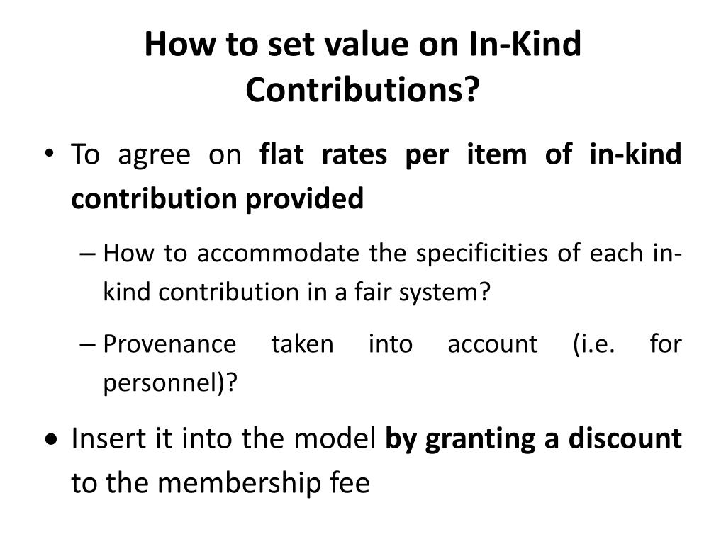 How to set value on In-Kind Contributions? • To agree on flat rates per item of in-kind contribution provided • How to accommodate the specificities of each in-kind contribution in a fair system? • Provenance taken into account (i.e. for personnel)? • Insert it into the model bygranting a discount to the membership fee