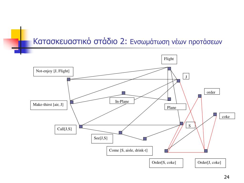 Flight Not-enjoy [J, Flight] J order In-Plane Make-thirst [air, J] Plane coke S Call[J,S] See[J,S] Come [S, aisle, drink-t] Order[S, coke] Order[J, coke] Κατασκευαστικό στάδιο 2: Ενσωμάτωση νέων προτάσεων