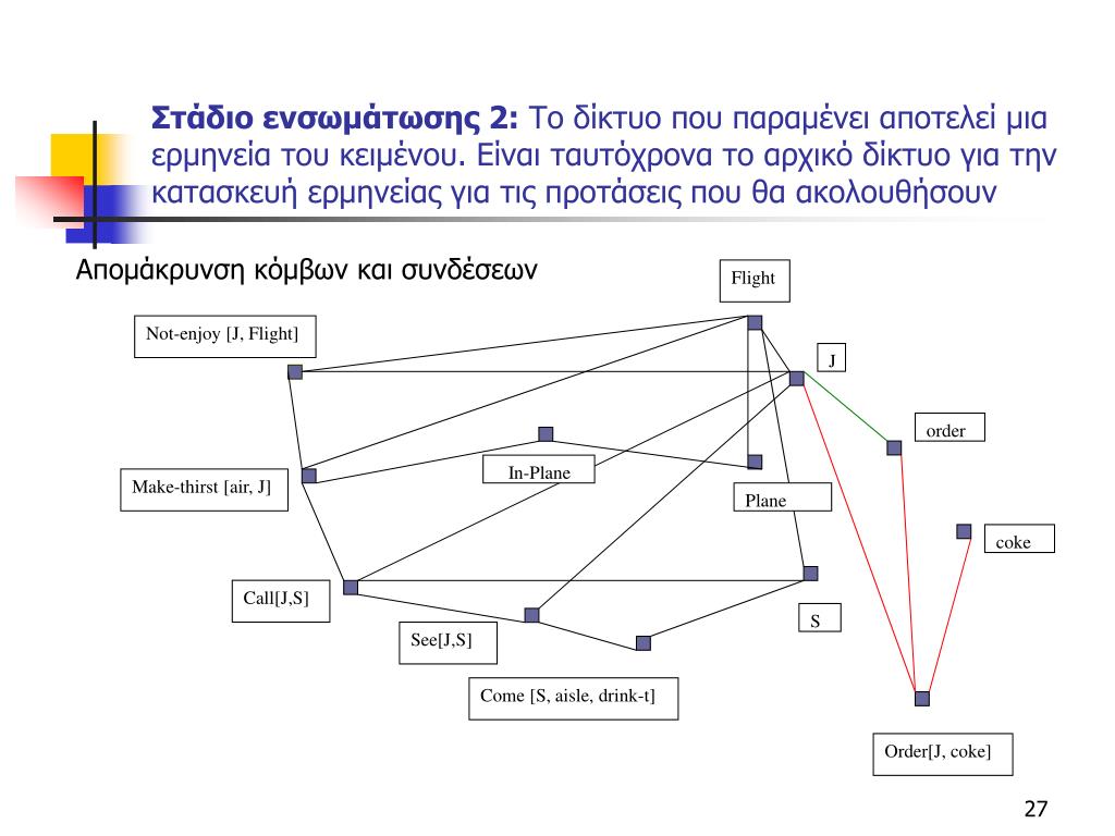 Flight Not-enjoy [J, Flight] J order In-Plane Make-thirst [air, J] Plane coke Call[J,S] S See[J,S] Come [S, aisle, drink-t] Order[J, coke] Στάδιο ενσωμάτωσης 2:Το δίκτυο που παραμένει αποτελεί μια ερμηνεία του κειμένου. Είναι ταυτόχρονα το αρχικό δίκτυο για την κατασκευή ερμηνείας για τις προτάσεις που θα ακολουθήσουν Απομάκρυνση κόμβων και συνδέσεων