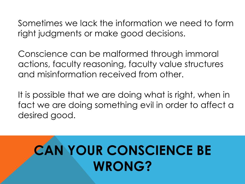 Sometimes we lack the information we need to form right judgments or make good decisions. Conscience can be malformed through immoral actions, faculty reasoning, faculty value structures and misinformation received from other. It is possible that we are doing what is right, when in fact we are doing something evil in order to affect a desired good. CAN YOUR CONSCIENCE BE WRONG?