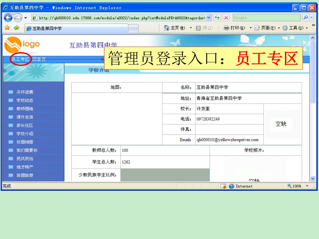 管理员登录入口是员工专区 帐号就是学校编号缩写加admin,例如 陕西上洼小学(sx000052),网站开通后账号sx52admin 默认登录密码 sx000052