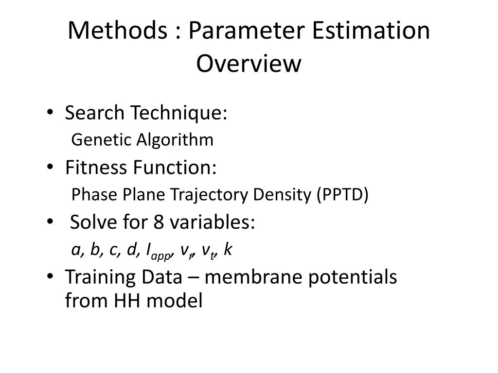 Methods : Parameter Estimation Overview • Search Technique: Genetic Algorithm • Fitness Function: Phase Plane Trajectory Density (PPTD) • Solve for 8 variables: a, b, c, d, Iapp, vr, vt, k • Training Data – membrane potentials from HH model