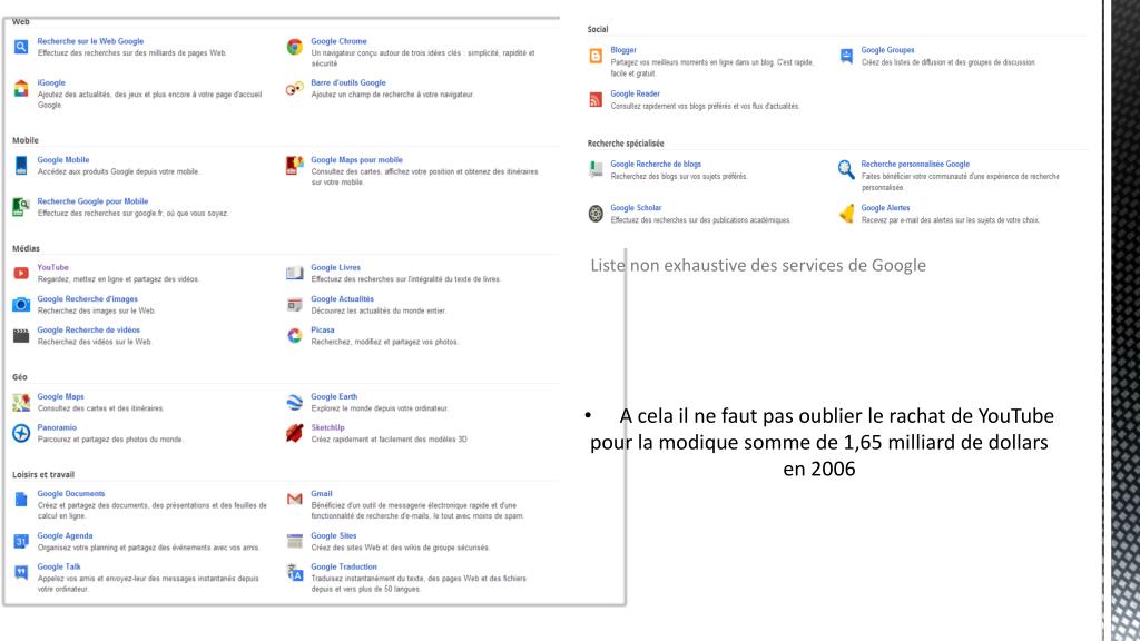 Liste non exhaustive des services de Google • A cela il ne faut pas oublier le rachat de YouTube • pour la modique somme de 1,65 milliard de dollars • en 2006