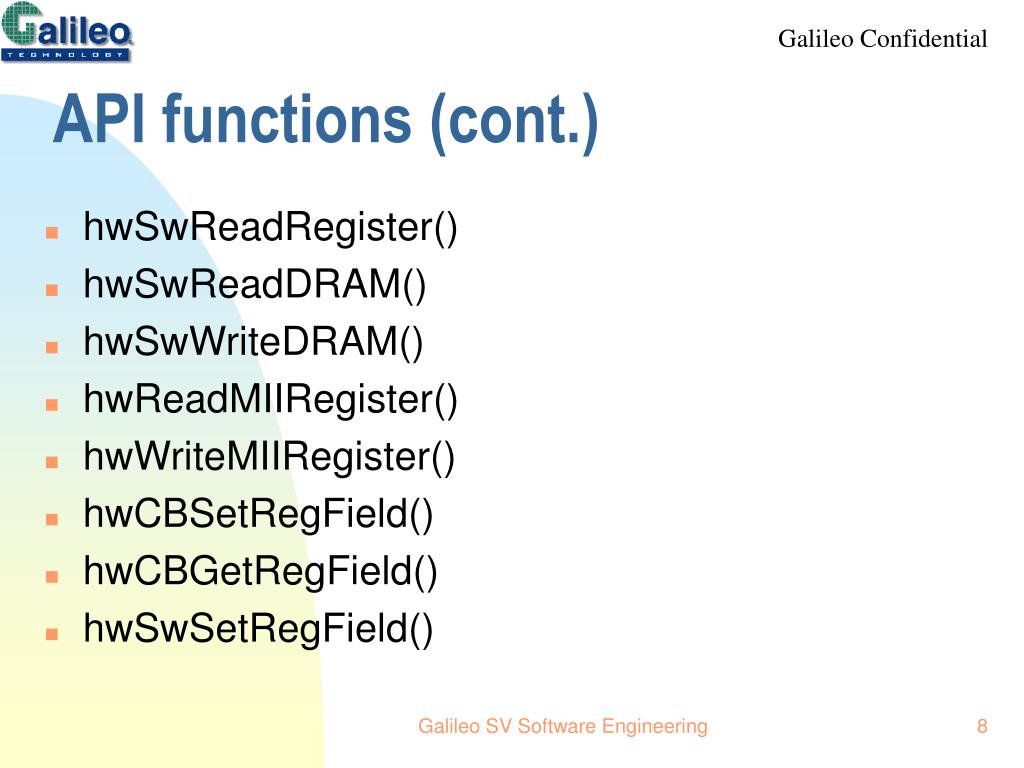 API functions (cont.) • hwSwReadRegister() • hwSwReadDRAM() • hwSwWriteDRAM() • hwReadMIIRegister() • hwWriteMIIRegister() • hwCBSetRegField() • hwCBGetRegField() • hwSwSetRegField() Galileo SV Software Engineering