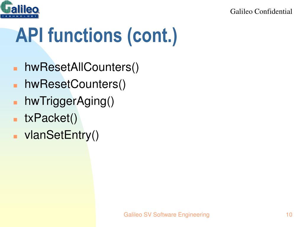 API functions (cont.) • galnetInitDevTables() • galnetIncrInitDevTables() • hashRstCPUTable() • hashCPUNewAddr() • hashInsert2CPUTable() • hashCPUSkipAddr() • hashQueryCPUAddr() • hashCountCPUAddr() Galileo SV Software Engineering