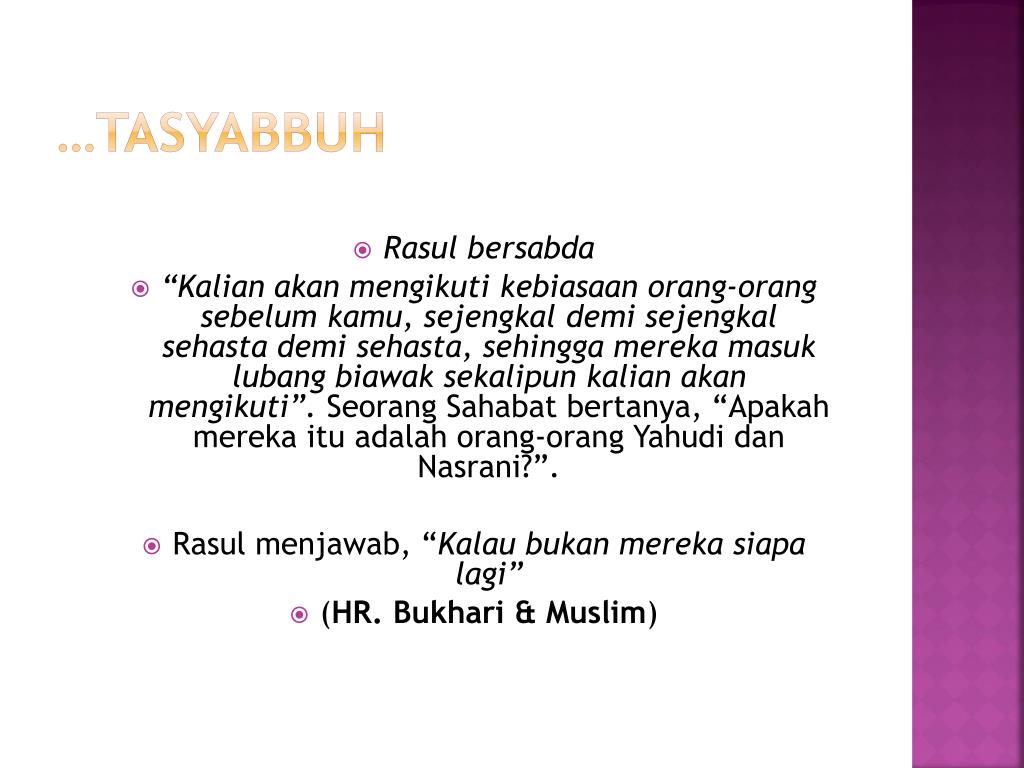 …tasyabbuh • Rasulbersabda • “Kalian akanmengikutikebiasaanorang-orangsebelumkamu, sejengkaldemisejengkalsehastademisehasta, sehinggamerekamasuklubangbiawaksekalipun kalian akanmengikuti”. SeorangSahabatbertanya, “Apakahmerekaituadalahorang-orangYahudidanNasrani?”. • Rasulmenjawab, “Kalaubukanmerekasiapalagi” • (HR. Bukhari & Muslim)