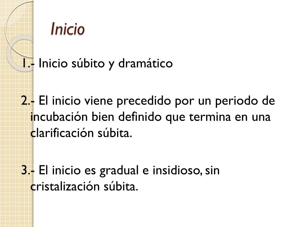 Inicio 1.- Inicio súbito y dramático 2.- El inicio viene precedido por un periodo de incubación bien definido que termina en una clarificación súbita. 3.- El inicio es gradual e insidioso, sin cristalización súbita.