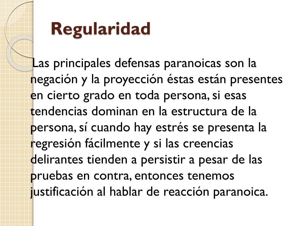 Regularidad Las principales defensas paranoicas son la negación y la proyección éstas están presentes en cierto grado en toda persona, si esas tendencias dominan en la estructura de la persona, sí cuando hay estrés se presenta la regresión fácilmente y si las creencias delirantes tienden a persistir a pesar de las pruebas en contra, entonces tenemos justificación al hablar de reacción paranoica.