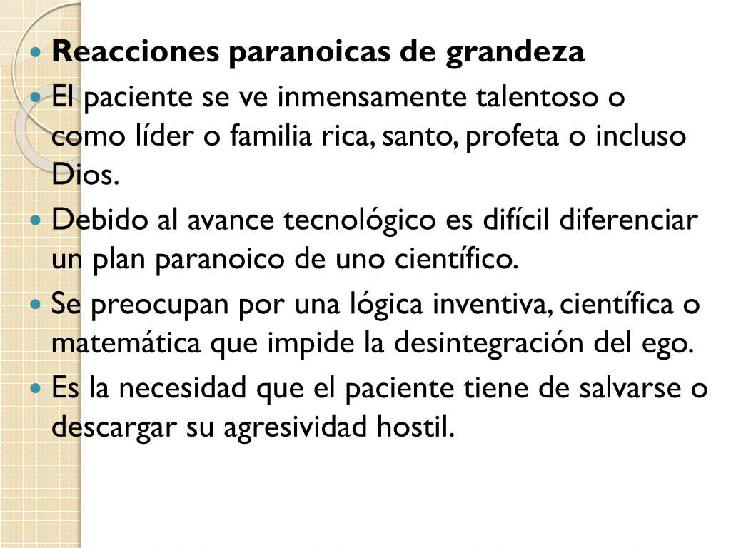 Reacciones paranoicas de grandeza • El paciente se ve inmensamente talentoso o como líder o familia rica, santo, profeta o incluso Dios. • Debido al avance tecnológico es difícil diferenciar un plan paranoico de uno científico. • Se preocupan por una lógica inventiva, científica o matemática que impide la desintegración del ego. • Es la necesidad que el paciente tiene de salvarse o descargar su agresividad hostil.