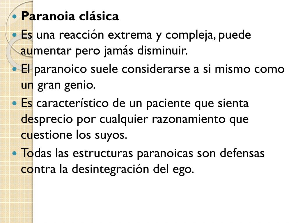 Paranoia clásica • Es una reacción extrema y compleja, puede aumentar pero jamás disminuir. • El paranoico suele considerarse a si mismo como un gran genio. • Es característico de un paciente que sienta desprecio por cualquier razonamiento que cuestione los suyos. • Todas las estructuras paranoicas son defensas contra la desintegración del ego.