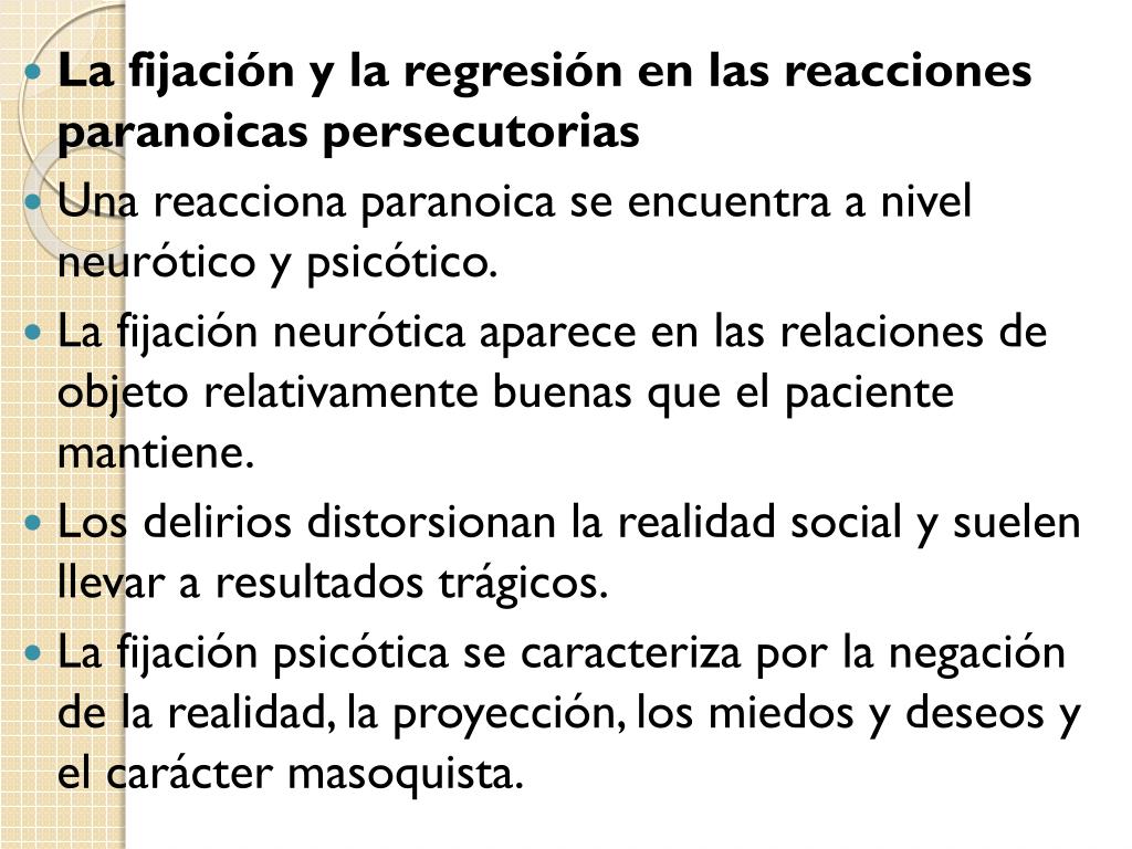 La fijación y la regresión en las reacciones paranoicas persecutorias • Una reacciona paranoica se encuentra a nivel neurótico y psicótico. • La fijación neurótica aparece en las relaciones de objeto relativamente buenas que el paciente mantiene. • Los delirios distorsionan la realidad social y suelen llevar a resultados trágicos. • La fijación psicótica se caracteriza por la negación de la realidad, la proyección, los miedos y deseos y el carácter masoquista.