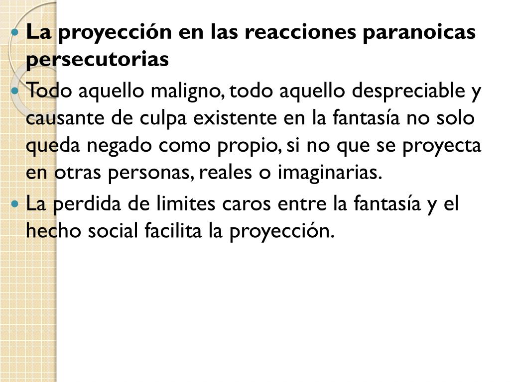 La proyección en las reacciones paranoicas persecutorias • Todo aquello maligno, todo aquello despreciable y causante de culpa existente en la fantasía no solo queda negado como propio, si no que se proyecta en otras personas, reales o imaginarias. • La perdida de limites caros entre la fantasía y el hecho social facilita la proyección.