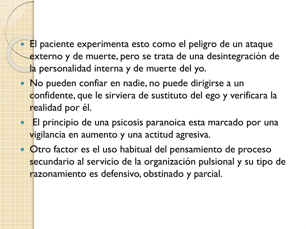 El paciente experimenta esto como el peligro de un ataque externo y de muerte, pero se trata de una desintegración de la personalidad interna y de muerte del yo. • No pueden confiar en nadie, no puede dirigirse a un confidente, que le sirviera de sustituto del ego y verificara la realidad por él. • El principio de una psicosis paranoica esta marcado por una vigilancia en aumento y una actitud agresiva. • Otro factor es el uso habitual del pensamiento de proceso secundario al servicio de la organización pulsional y su tipo de razonamiento es defensivo, obstinado y parcial.