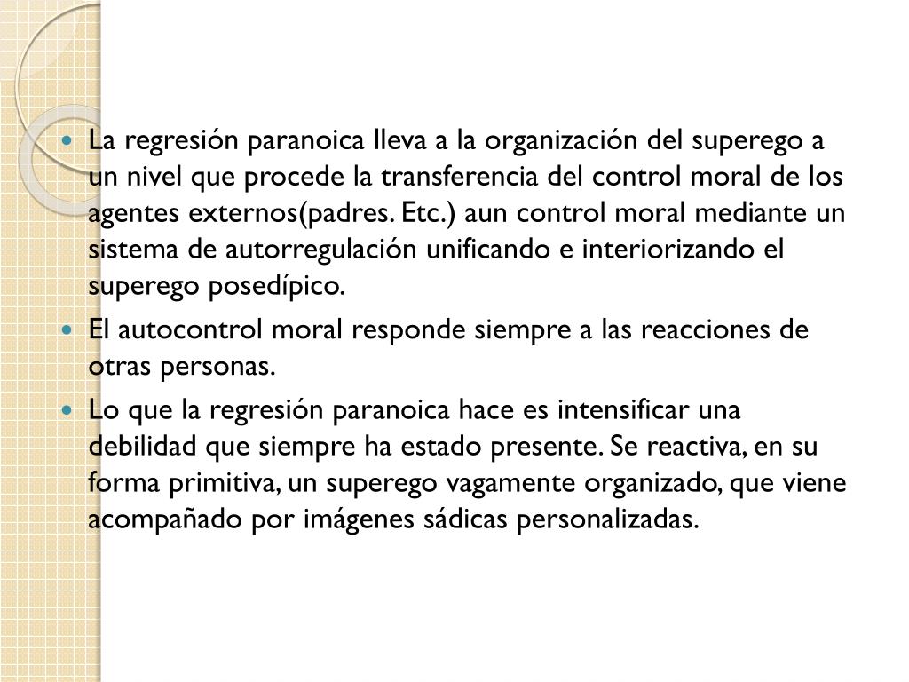 La regresión paranoica lleva a la organización del superego a un nivel que procede la transferencia del control moral de los agentes externos(padres. Etc.) aun control moral mediante un sistema de autorregulación unificando e interiorizando el superego posedípico. • El autocontrol moral responde siempre a las reacciones de otras personas. • Lo que la regresión paranoica hace es intensificar una debilidad que siempre ha estado presente. Se reactiva, en su forma primitiva, un superego vagamente organizado, que viene acompañado por imágenes sádicas personalizadas.