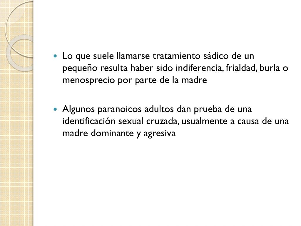 Lo que suele llamarse tratamiento sádico de un pequeño resulta haber sido indiferencia, frialdad, burla o menosprecio por parte de la madre • Algunos paranoicos adultos dan prueba de una identificación sexual cruzada, usualmente a causa de una madre dominante y agresiva