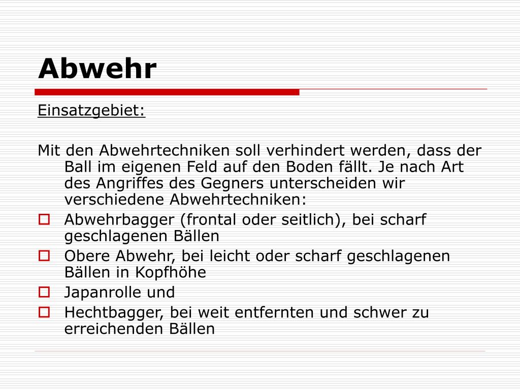 Abwehr Einsatzgebiet: Mit den Abwehrtechniken soll verhindert werden, dass der Ball im eigenen Feld auf den Boden fällt. Je nach Art des Angriffes des Gegners unterscheiden wir verschiedene Abwehrtechniken: • Abwehrbagger (frontal oder seitlich), bei scharf geschlagenen Bällen • Obere Abwehr, bei leicht oder scharf geschlagenen Bällen in Kopfhöhe • Japanrolle und • Hechtbagger, bei weit entfernten und schwer zu erreichenden Bällen