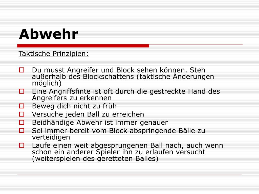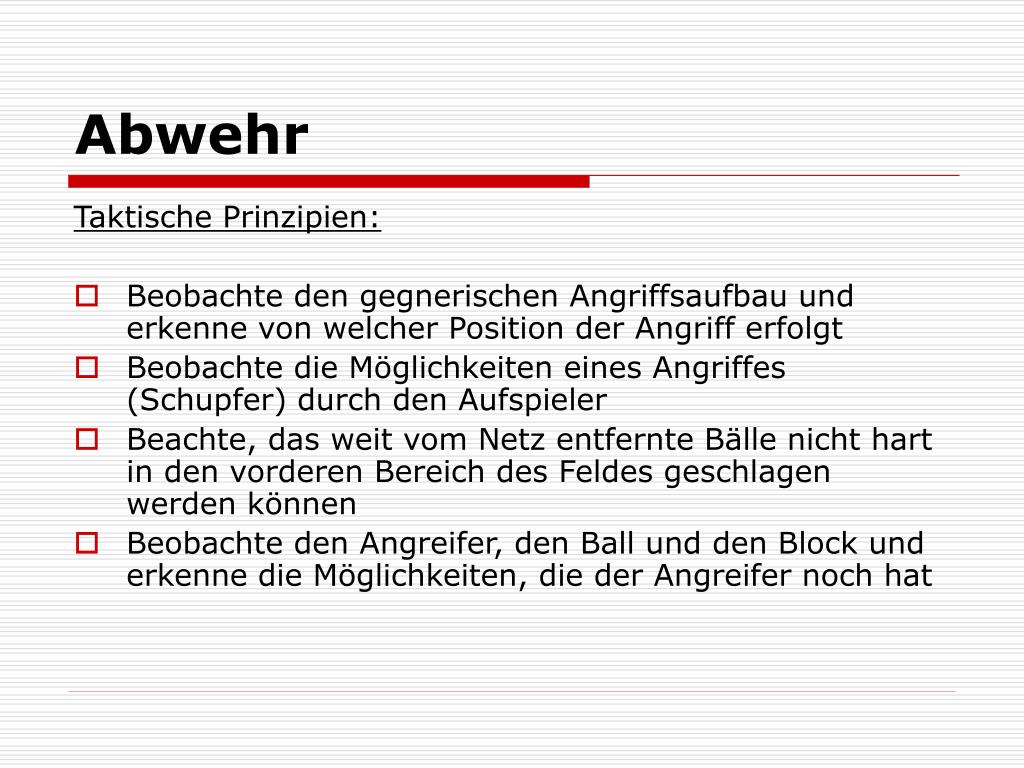 Abwehr Taktische Prinzipien: • Beobachte den gegnerischen Angriffsaufbau und erkenne von welcher Position der Angriff erfolgt • Beobachte die Möglichkeiten eines Angriffes (Schupfer) durch den Aufspieler • Beachte, das weit vom Netz entfernte Bälle nicht hart in den vorderen Bereich des Feldes geschlagen werden können • Beobachte den Angreifer, den Ball und den Block und erkenne die Möglichkeiten, die der Angreifer noch hat