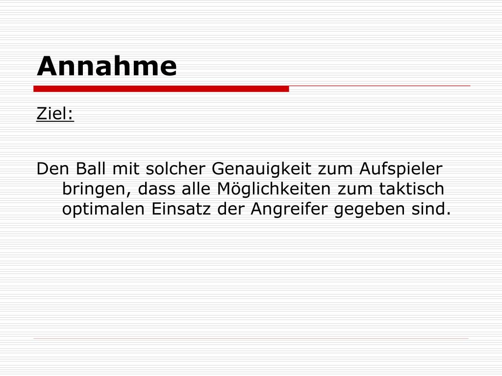 Annahme Ziel: Den Ball mit solcher Genauigkeit zum Aufspieler bringen, dass alle Möglichkeiten zum taktisch optimalen Einsatz der Angreifer gegeben sind.