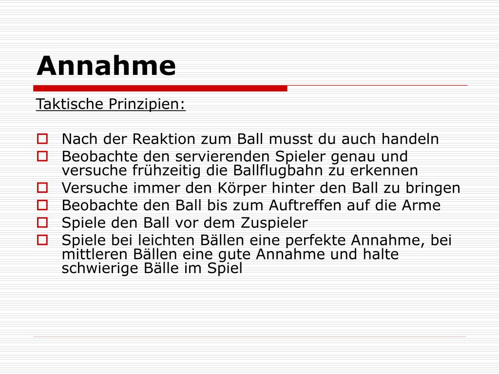 Annahme Taktische Prinzipien: • Nach der Reaktion zum Ball musst du auch handeln • Beobachte den servierenden Spieler genau und versuche frühzeitig die Ballflugbahn zu erkennen • Versuche immer den Körper hinter den Ball zu bringen • Beobachte den Ball bis zum Auftreffen auf die Arme • Spiele den Ball vor dem Zuspieler • Spiele bei leichten Bällen eine perfekte Annahme, bei mittleren Bällen eine gute Annahme und halte schwierige Bälle im Spiel