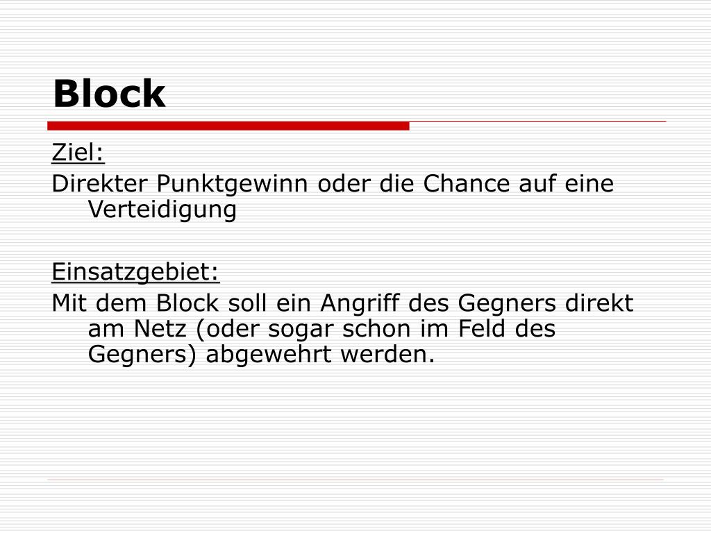 Block Ziel: Direkter Punktgewinn oder die Chance auf eine Verteidigung Einsatzgebiet: Mit dem Block soll ein Angriff des Gegners direkt am Netz (oder sogar schon im Feld des Gegners) abgewehrt werden.