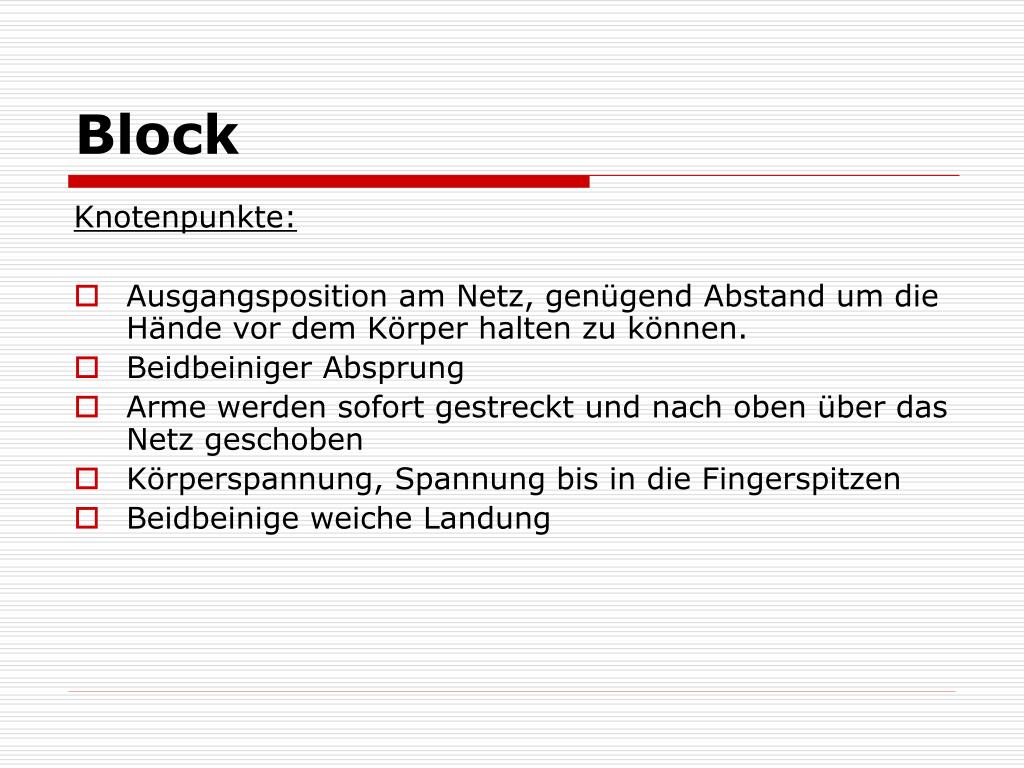 Block Knotenpunkte: • Ausgangsposition am Netz, genügend Abstand um die Hände vor dem Körper halten zu können. • Beidbeiniger Absprung • Arme werden sofort gestreckt und nach oben über das Netz geschoben • Körperspannung, Spannung bis in die Fingerspitzen • Beidbeinige weiche Landung
