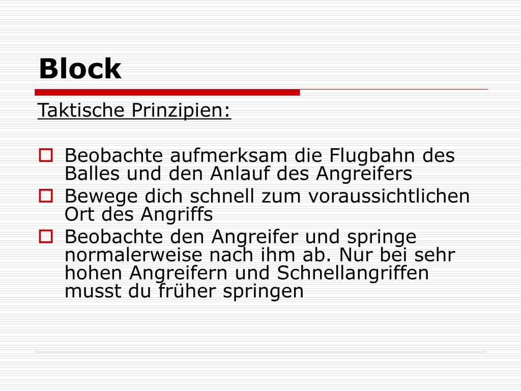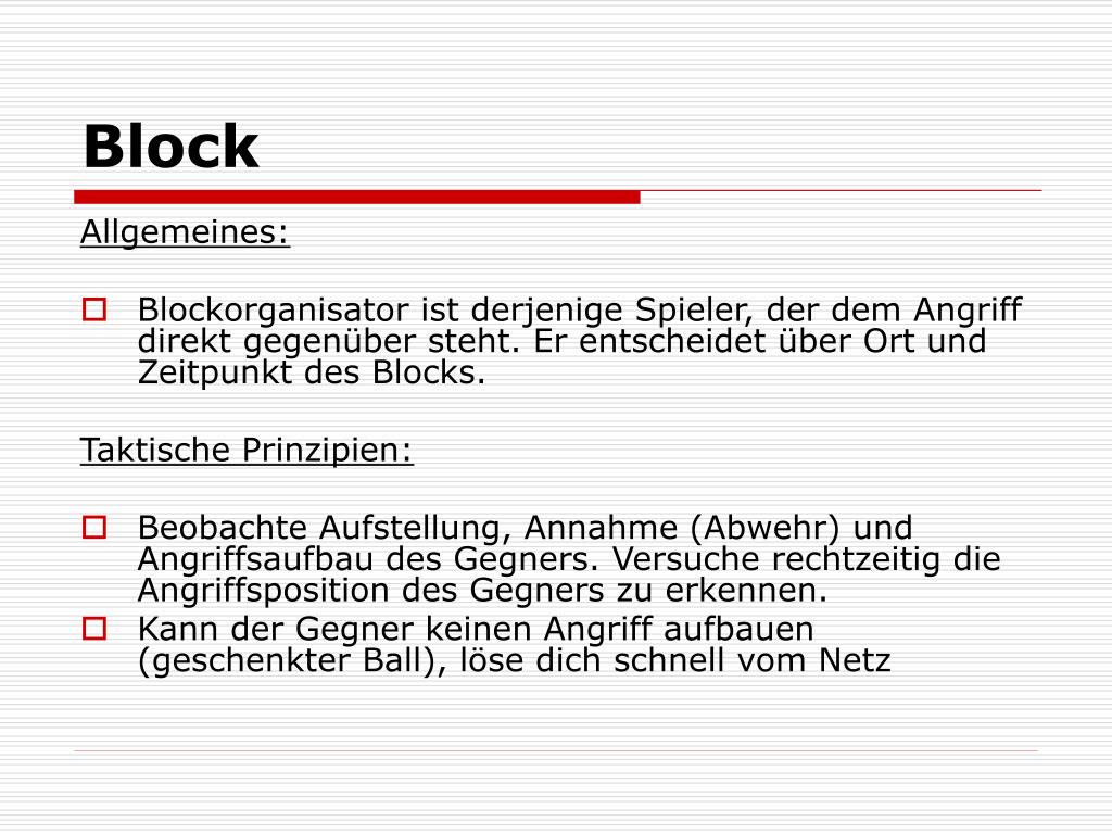 Block Allgemeines: • Blockorganisator ist derjenige Spieler, der dem Angriff direkt gegenüber steht. Er entscheidet über Ort und Zeitpunkt des Blocks. Taktische Prinzipien: • Beobachte Aufstellung, Annahme (Abwehr) und Angriffsaufbau des Gegners. Versuche rechtzeitig die Angriffsposition des Gegners zu erkennen. • Kann der Gegner keinen Angriff aufbauen (geschenkter Ball), löse dich schnell vom Netz