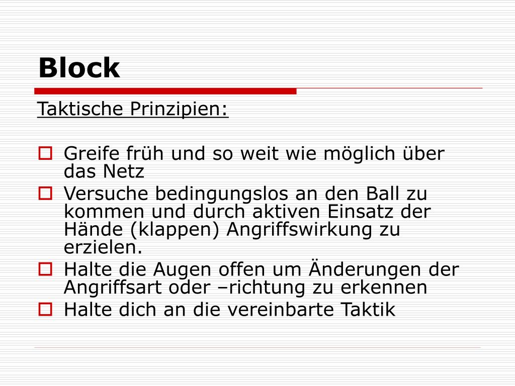Block Taktische Prinzipien: • Greife früh und so weit wie möglich über das Netz • Versuche bedingungslos an den Ball zu kommen und durch aktiven Einsatz der Hände (klappen) Angriffswirkung zu erzielen. • Halte die Augen offen um Änderungen der Angriffsart oder –richtung zu erkennen • Halte dich an die vereinbarte Taktik