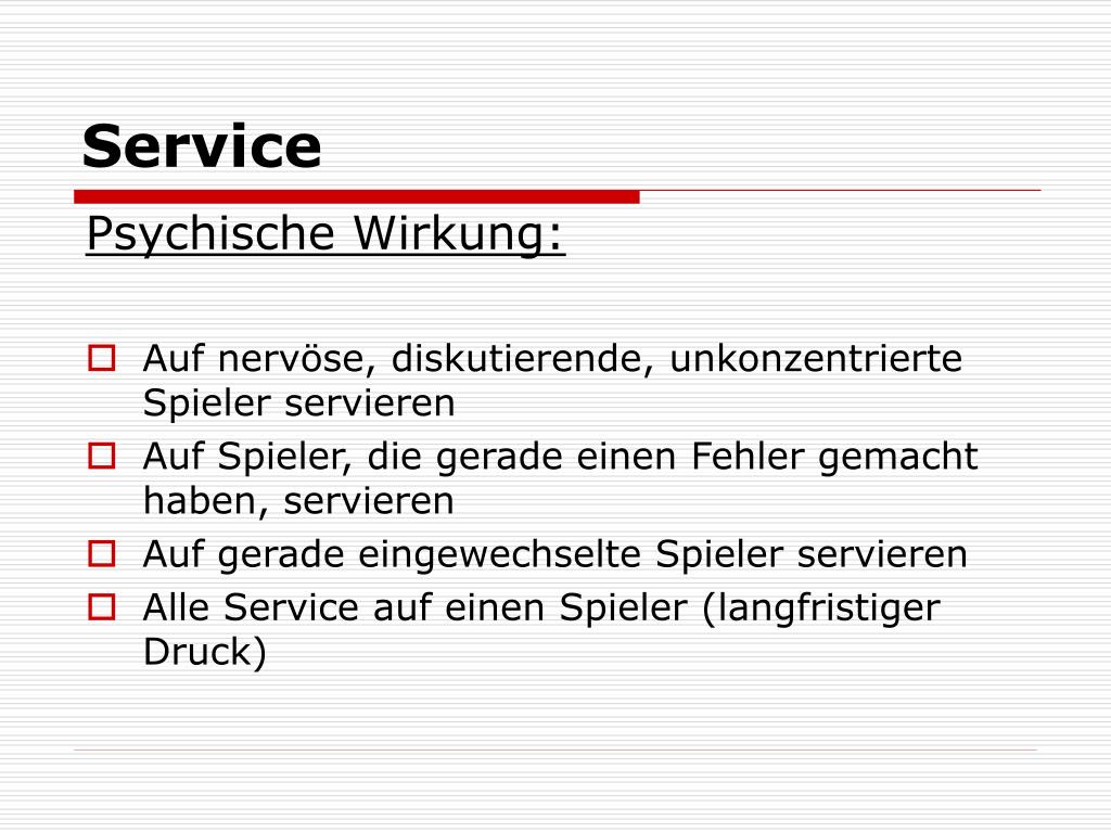 Service Psychische Wirkung: • Auf nervöse, diskutierende, unkonzentrierte Spieler servieren • Auf Spieler, die gerade einen Fehler gemacht haben, servieren • Auf gerade eingewechselte Spieler servieren • Alle Service auf einen Spieler (langfristiger Druck)