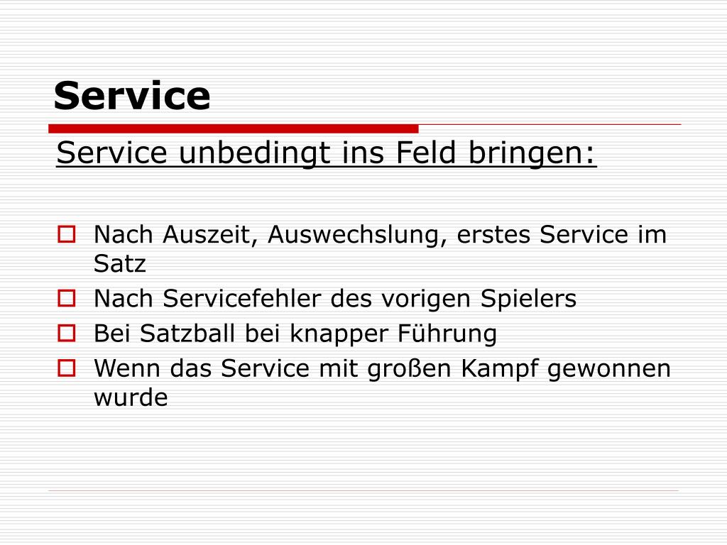 Service Service unbedingt ins Feld bringen: • Nach Auszeit, Auswechslung, erstes Service im Satz • Nach Servicefehler des vorigen Spielers • Bei Satzball bei knapper Führung • Wenn das Service mit großen Kampf gewonnen wurde
