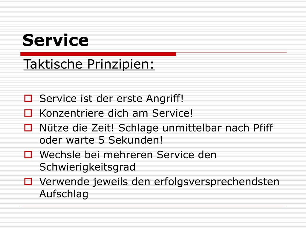 Service Taktische Prinzipien: • Service ist der erste Angriff! • Konzentriere dich am Service! • Nütze die Zeit! Schlage unmittelbar nach Pfiff oder warte 5 Sekunden! • Wechsle bei mehreren Service den Schwierigkeitsgrad • Verwende jeweils den erfolgsversprechendsten Aufschlag